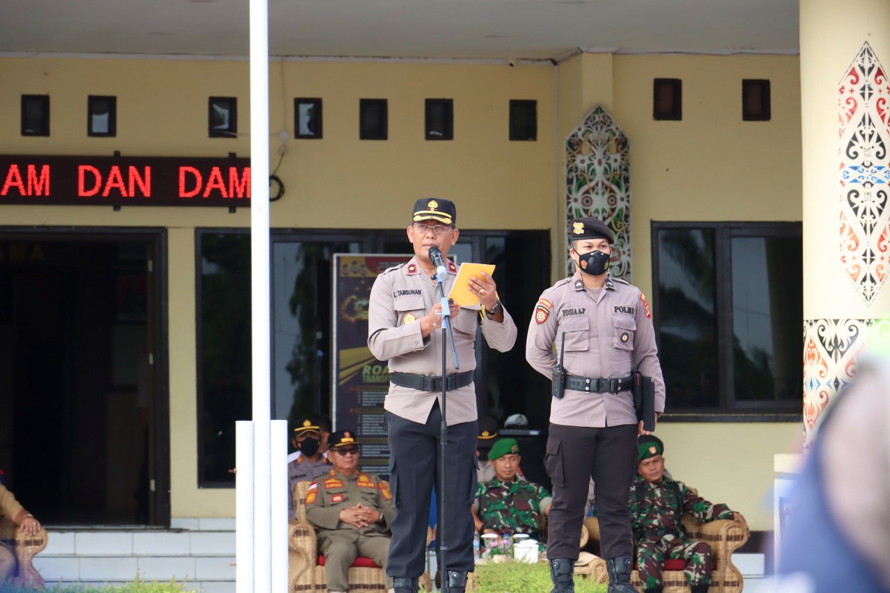 Sebelum memberikan amanat, Wakapolres Malinau KOMPOL Lafrin Tambunan, S.H., terlebih dahulu melakukan pengecekan pasukan dilanjutkan dengan menyematkan pita tanda Operasi kepada perwakilan dari personel Polri, TNI, Dishub dan Satpol-PP.