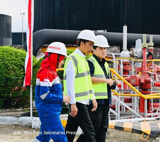 Dumai – Presiden Joko Widodo menyambangi tangki timbun di Kompleks Pertamina di Kota Dumai, Kamis (5/1/2023) dalam rangka melihat kinerja pekerja Blok Rokan yang ada di Dumai. Presiden disambut langsung oleh Direktur Utama PT Pertamina (Persero), Nicke Widyawati, Direktur Utama Pertamina Hulu Energi (PHE), Wiko Migantoro, dan Direktur Utama Pertamina Hulu Rokan, Jaffee Arizon Suardin, di Gedung Control Room. Dalam kunjungan ini, Presiden Joko Widodo juga didampingi oleh Menteri Sekretaris Negara, Pratikno, Menteri BUMN, Erick Thohir, dan Menteri PUPR, Basuki Hadimuljono.