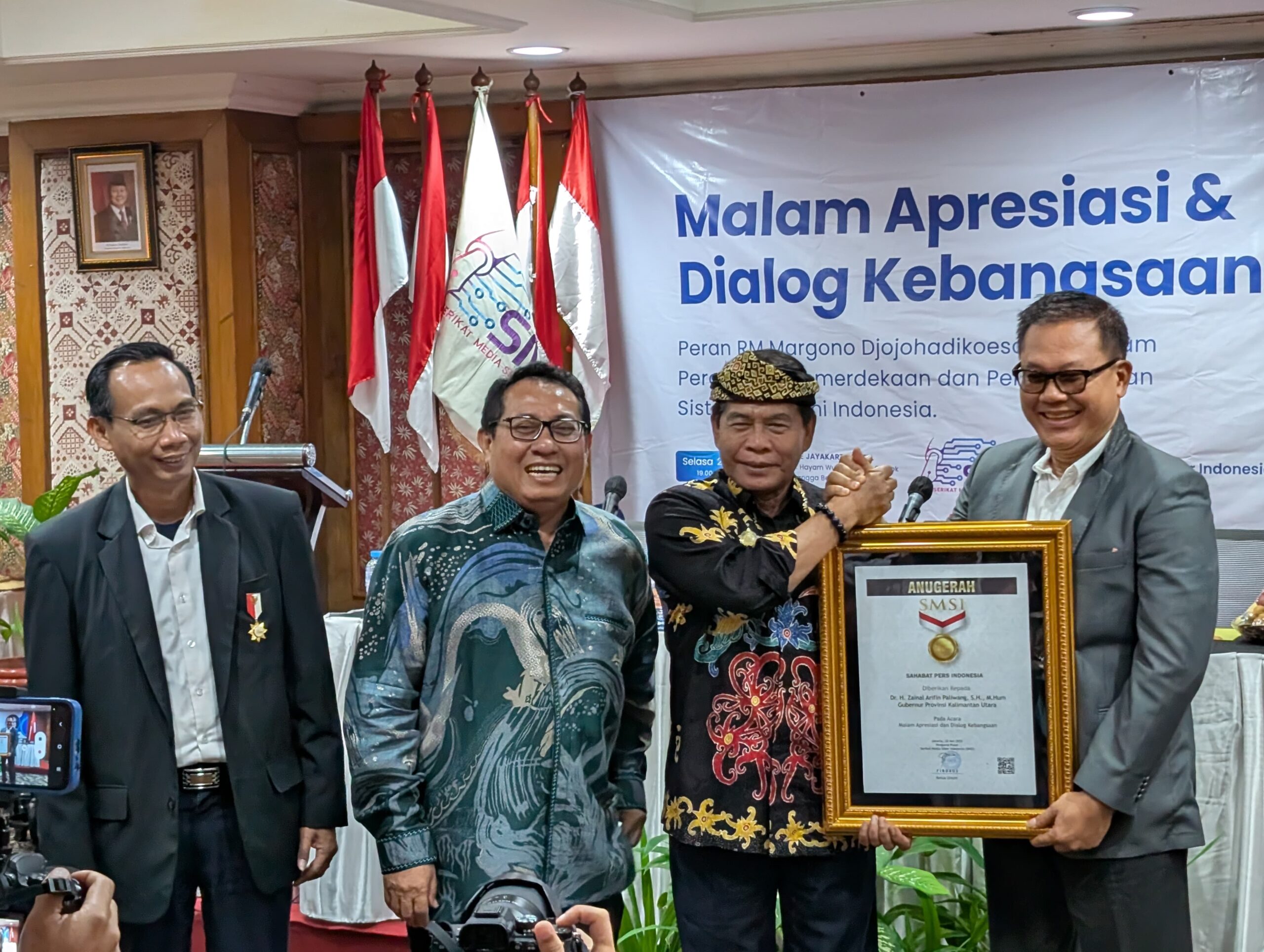 EQUATOR-TV-JAKARTA – Serikat Media Siber Indonesia (SMSI) Pusat memberikan penghargaan Sahabat Pers tahun 2025 kepada Gubernur Kalimantan Utara (Kaltara), Dr.H.Zainal A. Paliwang, SH, M.Hum, di Hotel Jayakarta, Jalan Hayam Wuruk, pada Selasa malam, (20/05/25).
